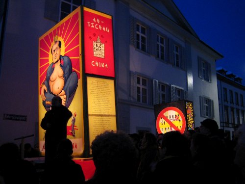 Wer «Baseldytsch» zu lesen imstande ist, wird sich über die neu geordneten Ausstellungen der am Morgenstreich mitgeführten Laternen und den Sujet-Wagen des Cortèges der beiden Fasnachts-Nachmittagumzüge vom Montag und Mittwoch freuen. Die Laternenausstellung ist, wie schon seit ein paar Jahren, jeweils von Montag Abend bis Mittwoch Morgen auf dem Münsterplatz, wo sie eine nicht nur fasnächtliche atmosphärische Stimmung zu verbreiten vermag. Neu sind dieses Jahr die besser organisierten Verpflegungsstätten, zumal auf dem Kasernen-Areal, wo die Requisiten und Wagen ausgestellt sind und die Beiz nun im warmen Kasernengebäude untergebracht ist.