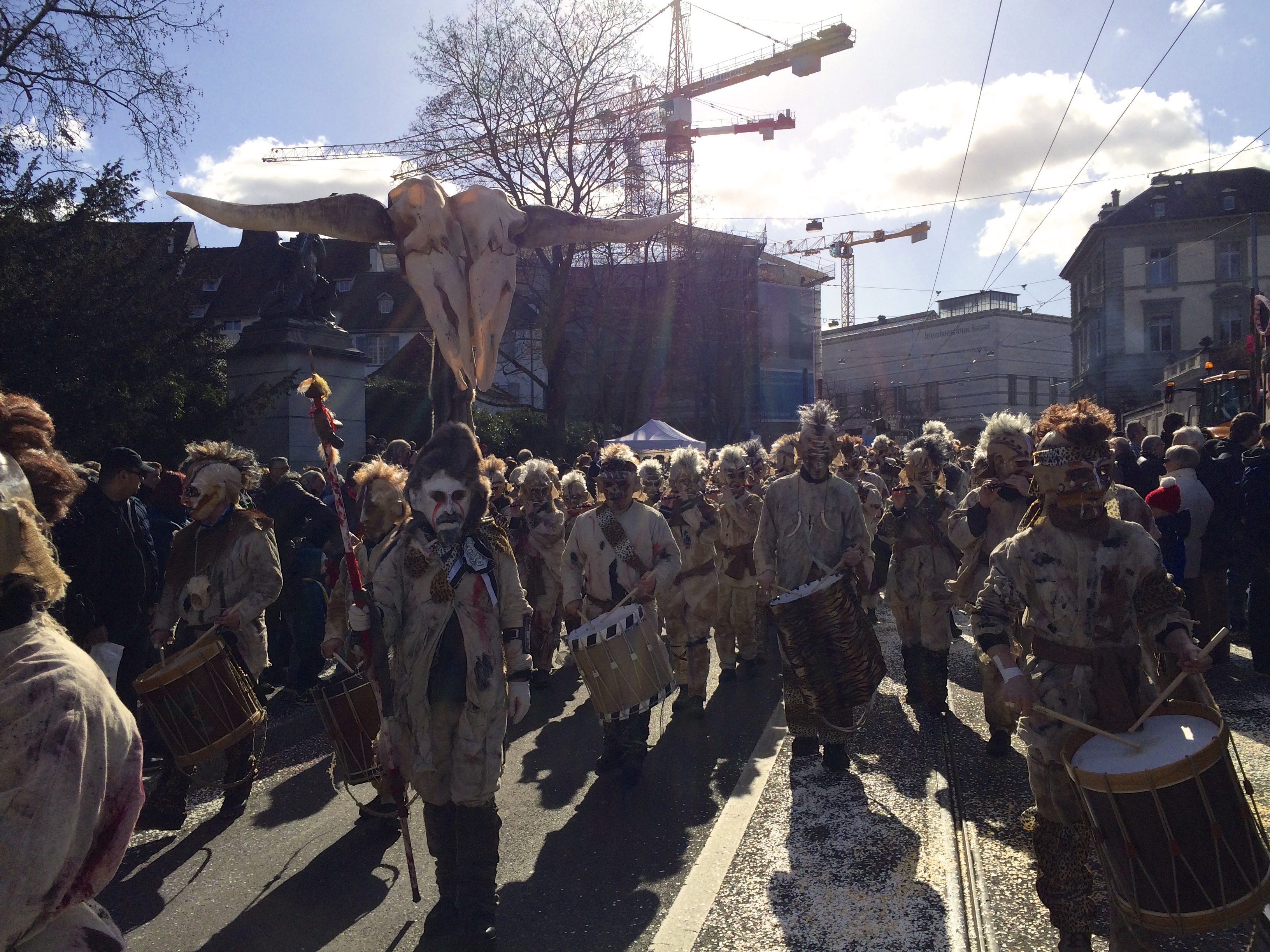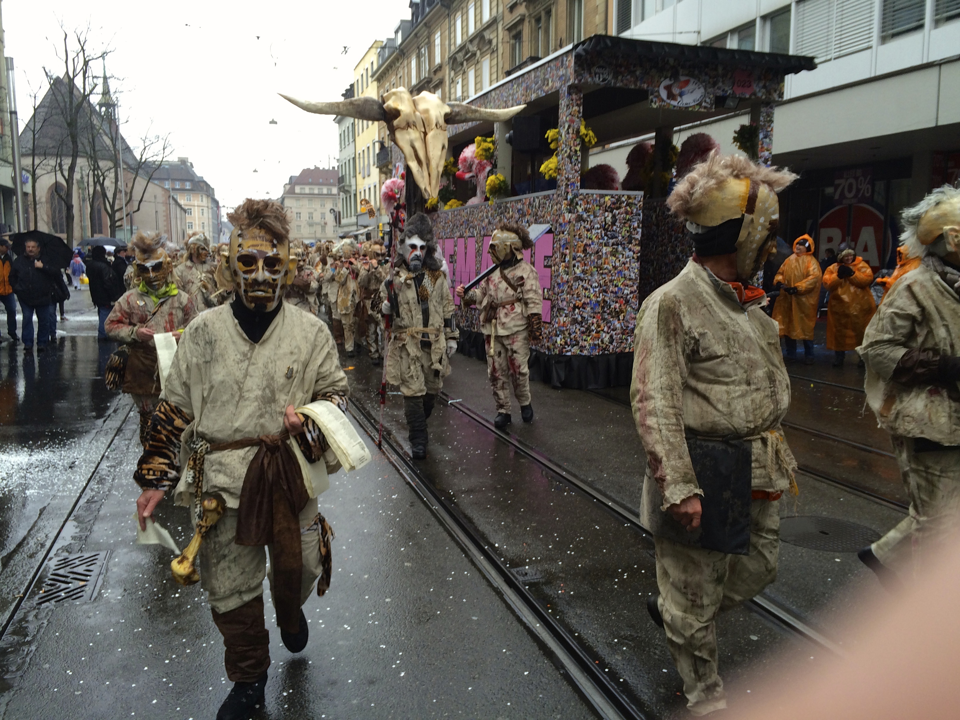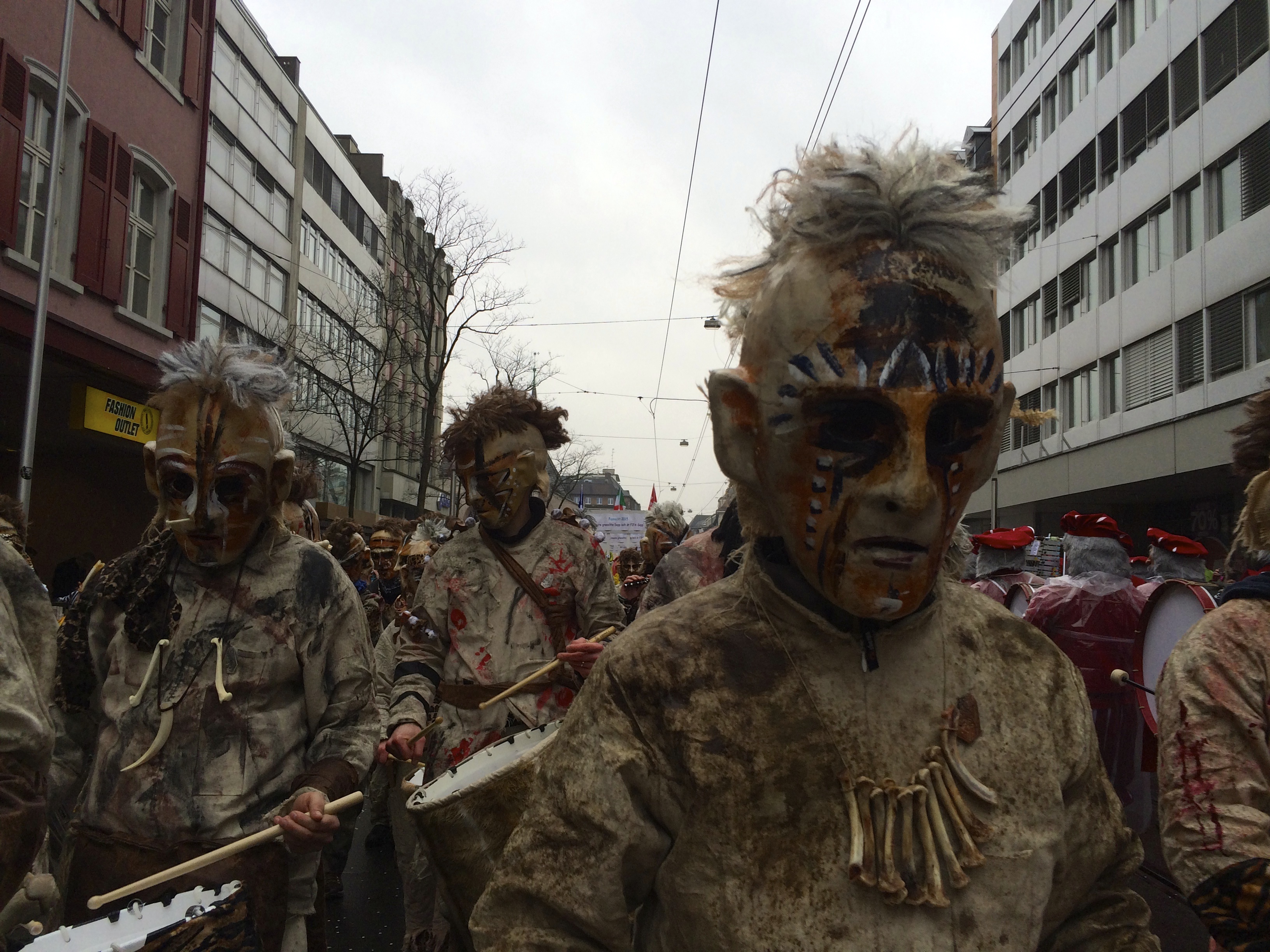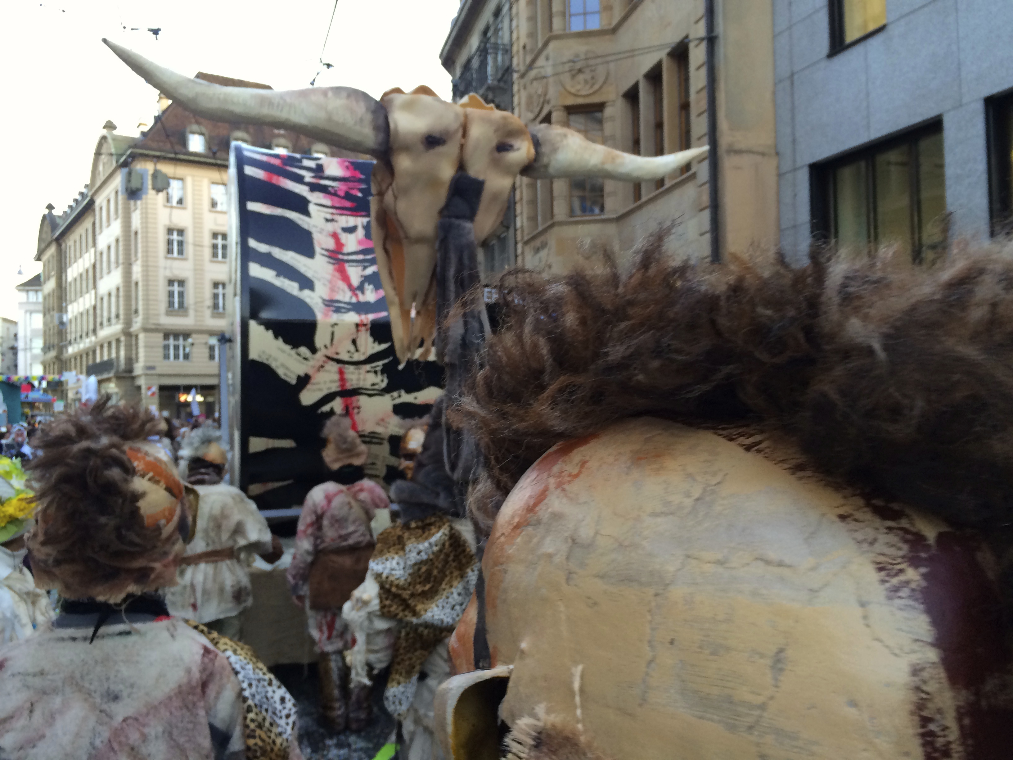 Denn am Nomidaag isches ändligg so wyyt gsy und mr sin am Claraplatz mit em Zugsgoschdyym yygstande. Neugierig hämr uns gegesytig agluegt, was die andere mitem Goschdym gmacht hän. Me het sich fast nit könne sattseh: E Monsterhorde mit de verschidenste Knöche, Schädel, Tattoos, Fäll und Farbe isch do gstande, eine dräckiger als die anderi.