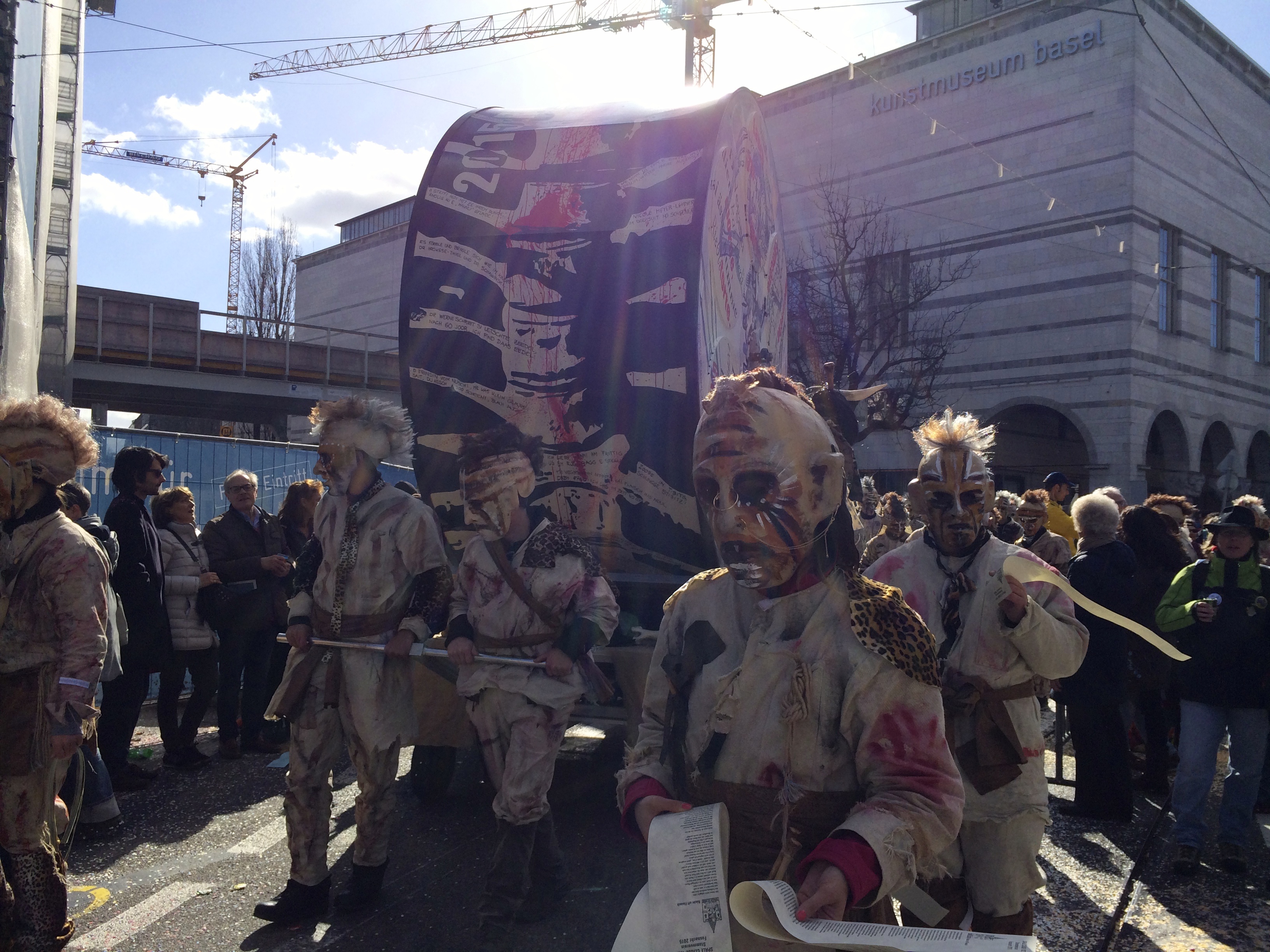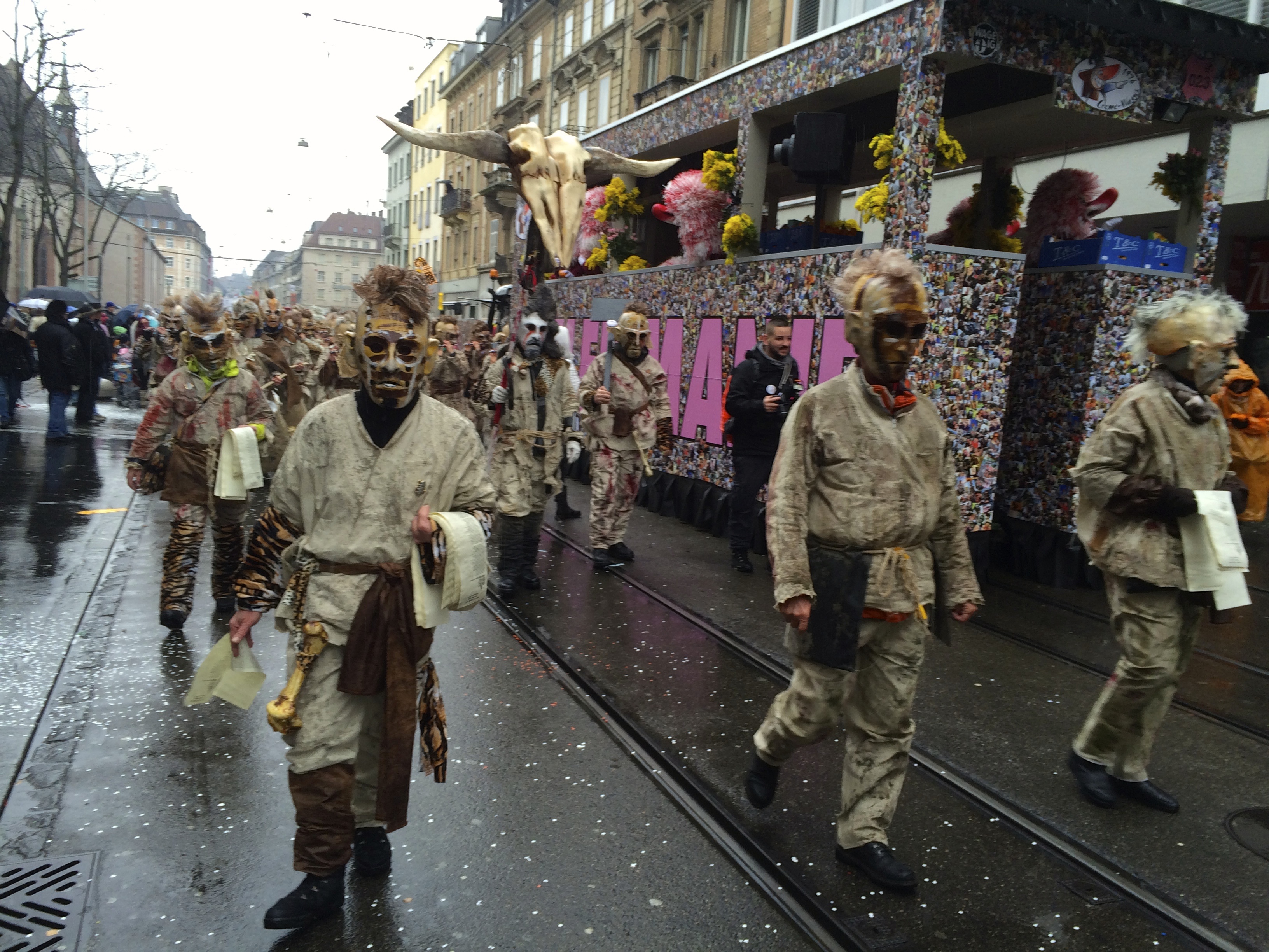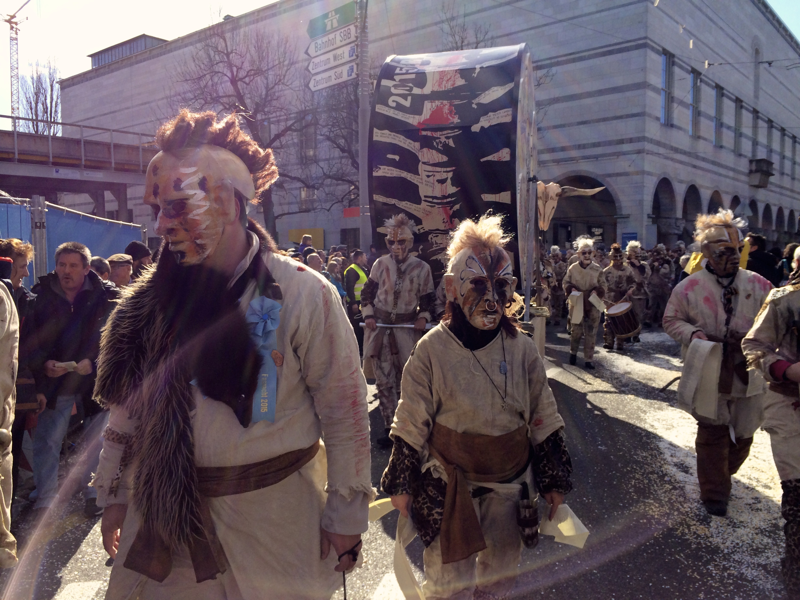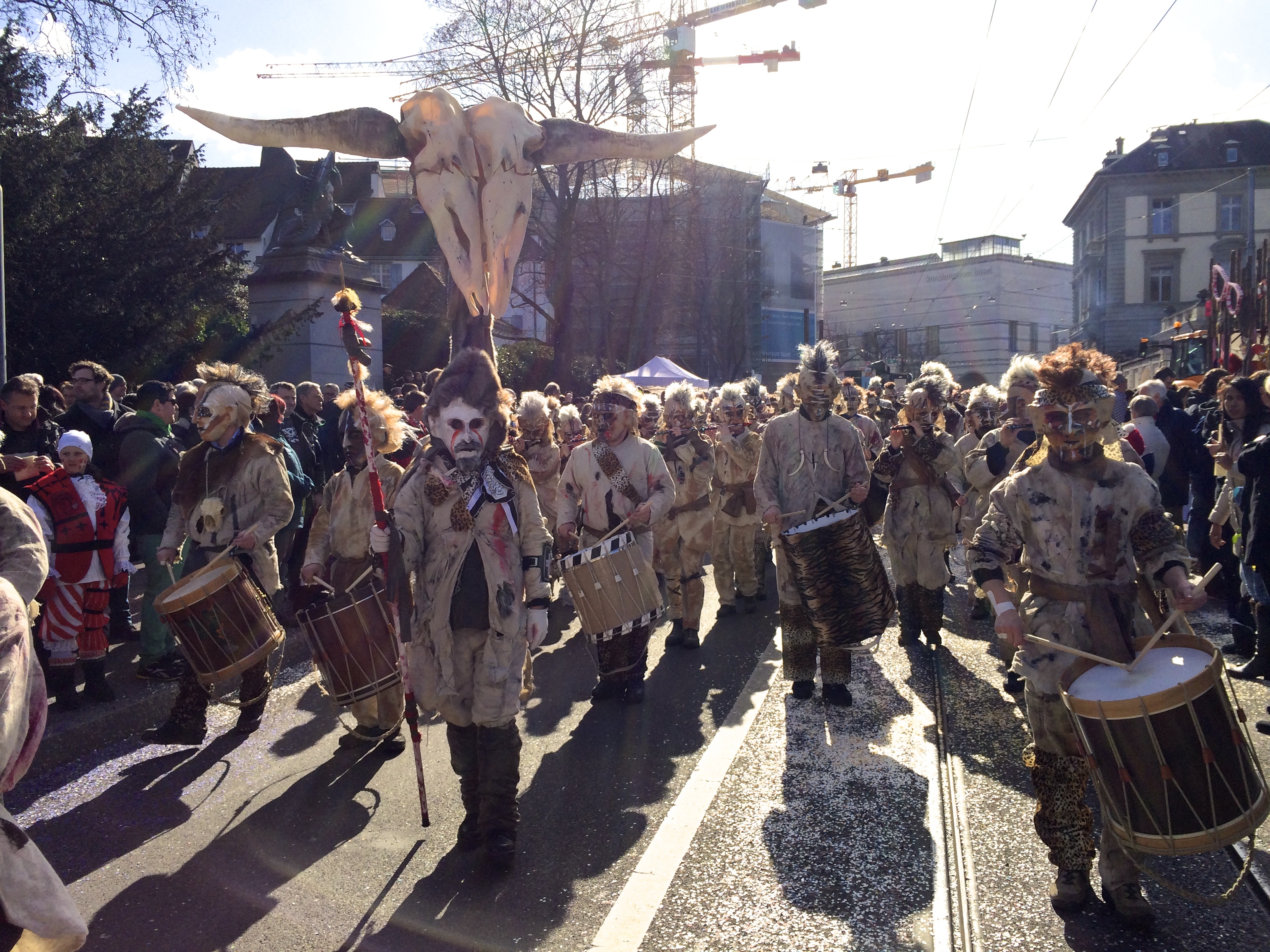 Denn am Nomidaag isches ändligg so wyyt gsy und mr sin am Claraplatz mit em Zugsgoschdyym yygstande. Neugierig hämr uns gegesytig agluegt, was die andere mitem Goschdym gmacht hän. Me het sich fast nit könne sattseh: E Monsterhorde mit de verschidenste Knöche, Schädel, Tattoos, Fäll und Farbe isch do gstande, eine dräckiger als die anderi.