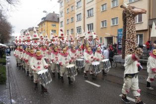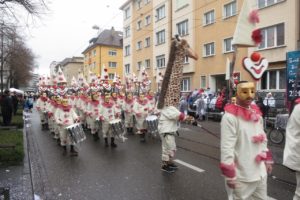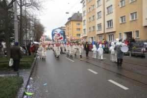 Mit eme lachende Gsicht hoch über de rund hundert Köpf isch dr Spale Stamm Zug an dr Fasnacht 2017 durch d Stadt gloffe und het drmit d Uffmerggsamkeit vo noch und färn uff sich zoge. S Wätter isch alles in allem eher grau und nass gsy, insbesondere am Mäntig isch me in de Pause tröchnet und denn aber püngtligg zum Ablaufe widr nass worde. Aber d Fasnacht isch jo nur eimol im Joor. D Lüt am Strooserand hets Wätter uff jede Fall nid gstört und es sin flyssig Fotis mit unserem Zug gmacht worde und me het bi Gross und Glai villi grossi Auge gseh.